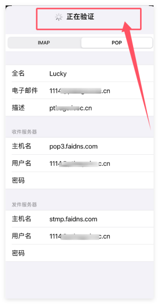 4、完成收发件服务器信息后,点击右上角【存储】,进入验证,页面显示【正在验证】(提示:验证可能需要1-2分钟,耐心等待)