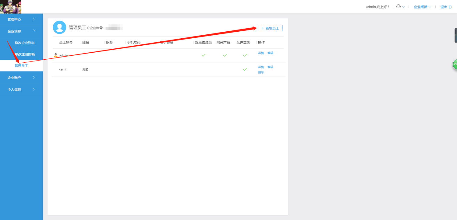 登录 企业中心-企业信息—管理成员-【新增成员】。填写对应的信息。成员姓名、权限、密码为必填。其他信息根据您的实际情况设置。点击保存即可完成成员账号的添加。