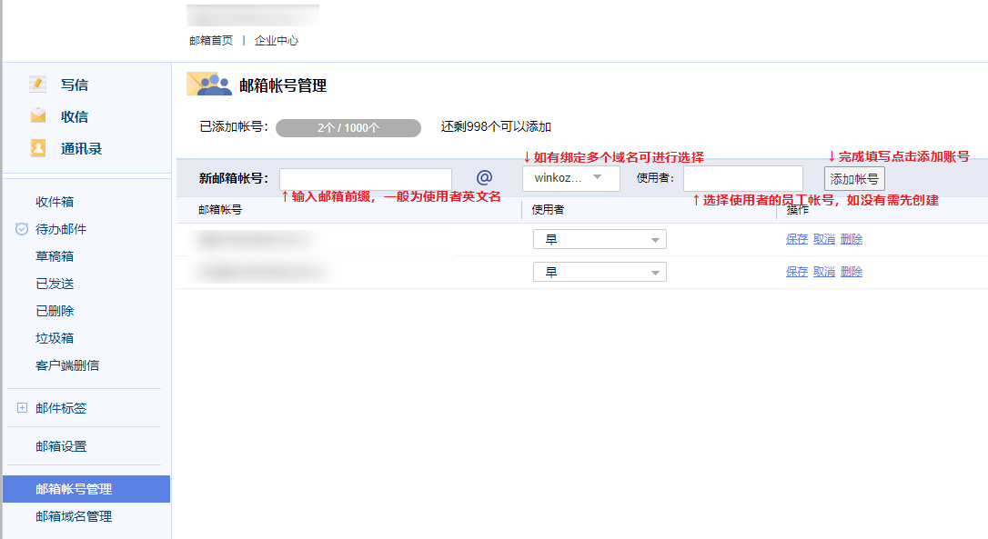 2、在企业邮箱 【邮箱账号管理】中添加邮箱账号。选择使用者为已添加的成员账号