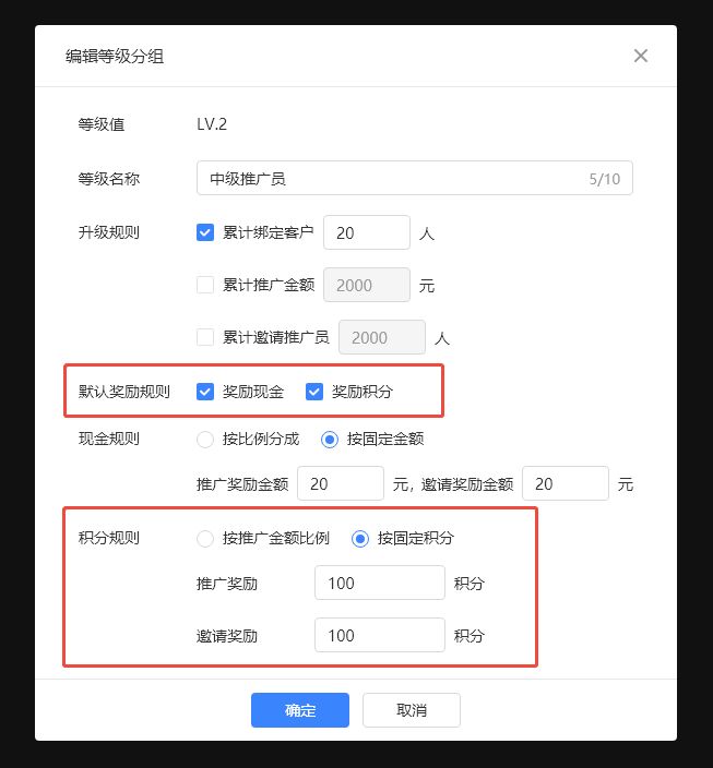 1、管理后台支持对不同推广员等级、不同推广产品设置纯积分奖励或者现金+积分组合奖励