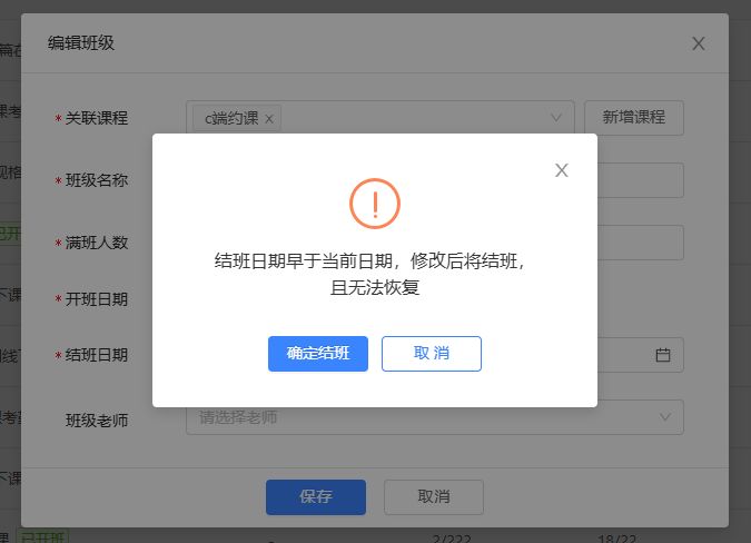 编辑班级-支持修改班级结班时间,若修改结班时间小于当前日期,将会直接结班。