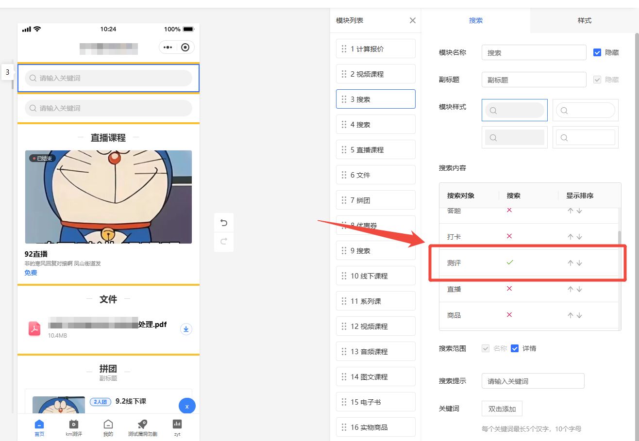 学员端搜索功能场景,支持搜索测评数据