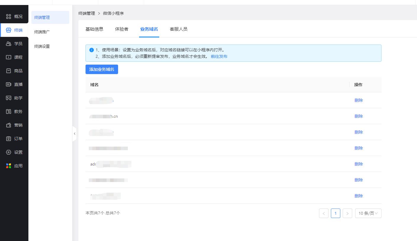 【重要!!】添加业务域名后,必须重新提审发布成功后,业务域名才会生效。