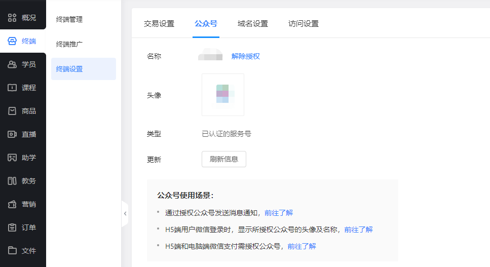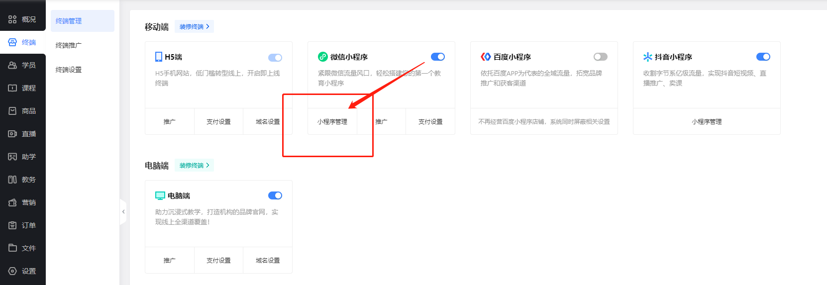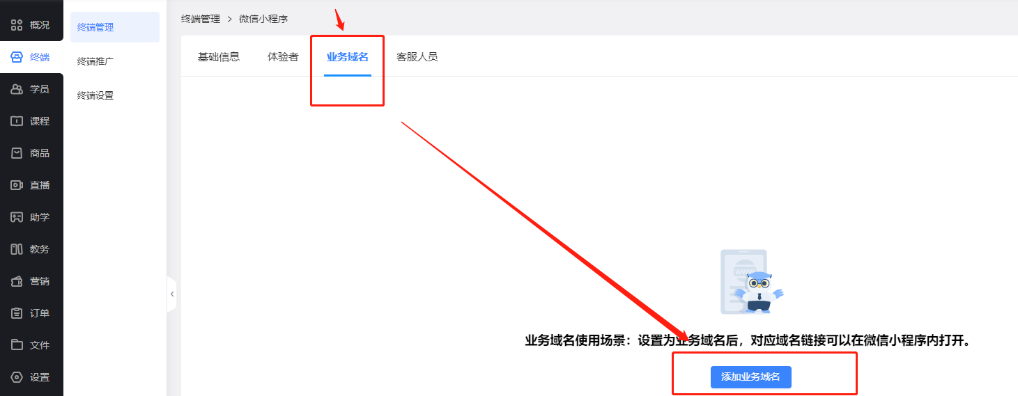 微信小程序:需要配置业务域名,前往教育后台,根据提示配置即可