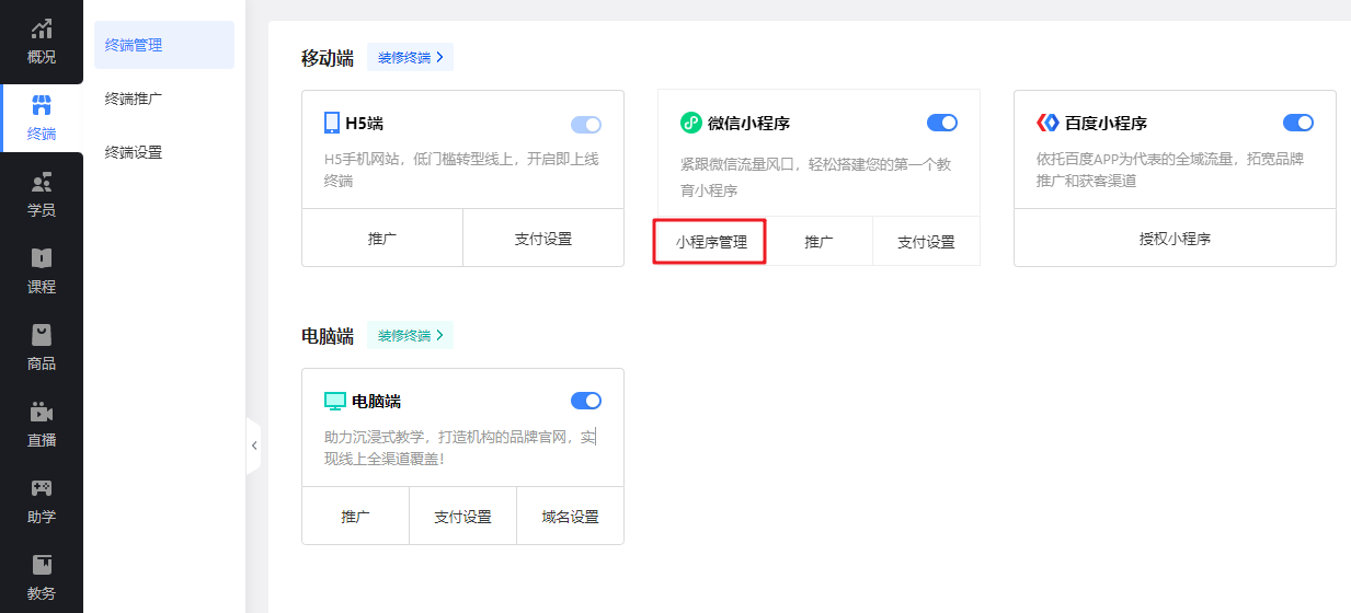 路径:管理后台-终端-终端管理-微信小程序-小程序管理