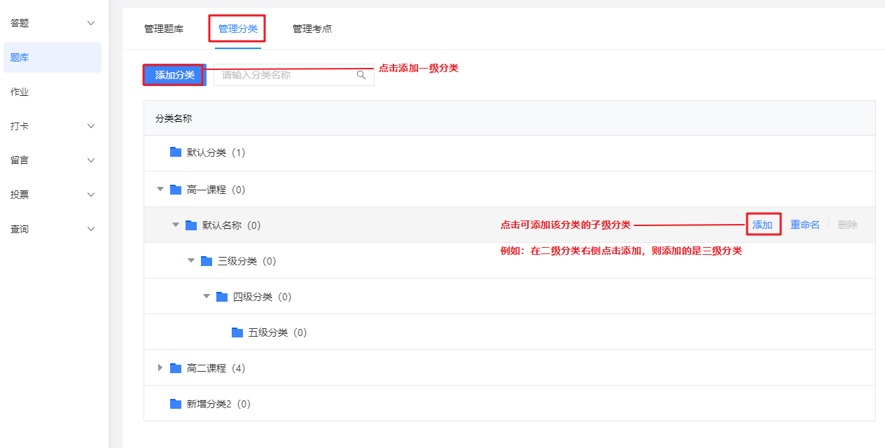 在【管理分类】中创建分类,支持题目多级分类,可创建子级分类,便于管理题目。