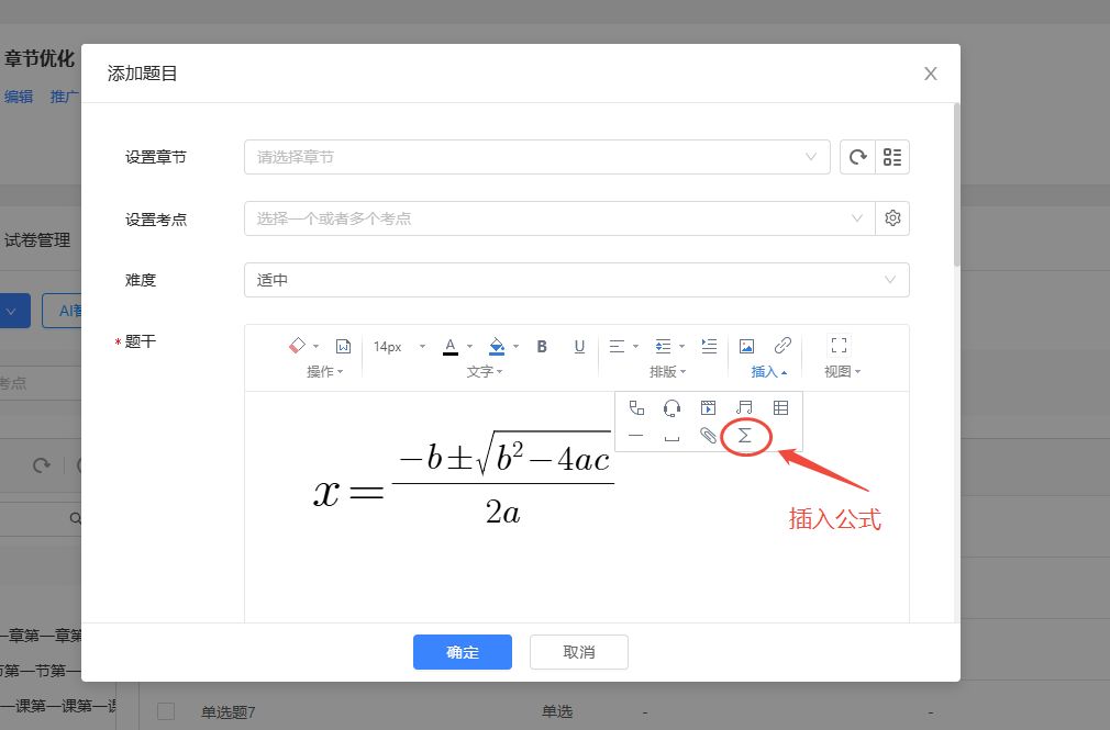 - 题干、答案解析:支持插入图片、音频、视频,支持排版操作。