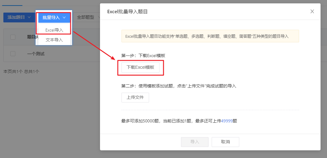 使用Excel模板录入题目后,将文件重新上传至管理后台,点击“导入”按钮,即可批量录入题目。