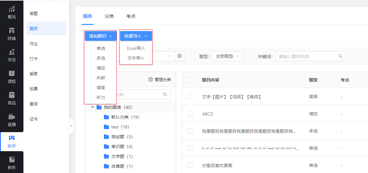 开启功能后,在【管理题库】中,可点击“添加题目”进行手动录题,也可点击“批量导入”进行批量录题。