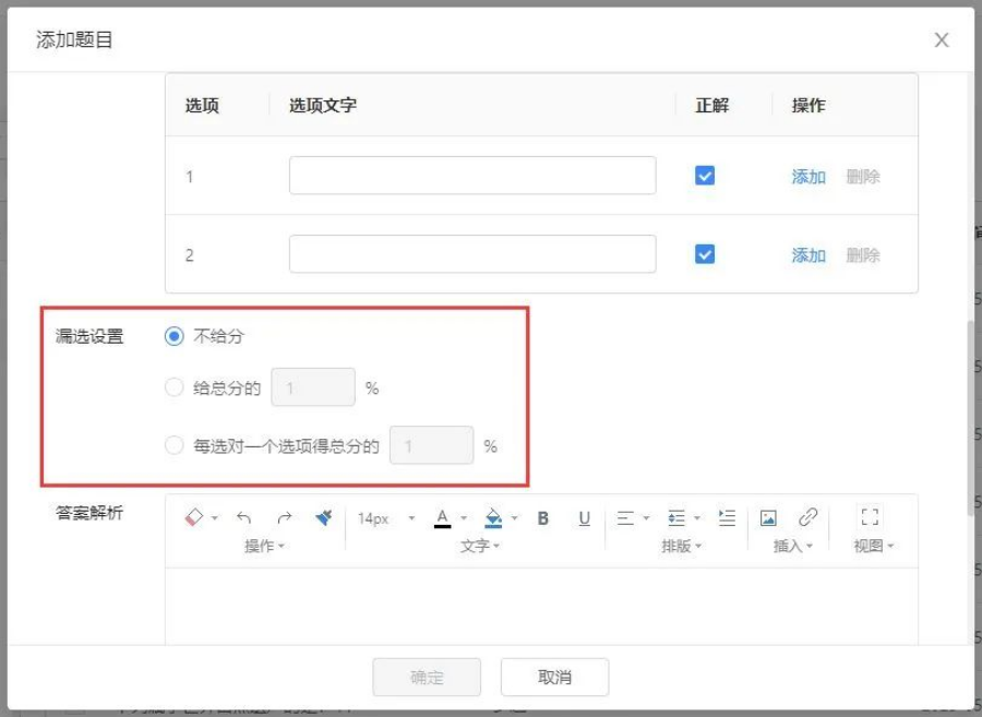 针对考试的这种计分规则,在我们创建多选题时,可以进行“漏选设置”的设置。