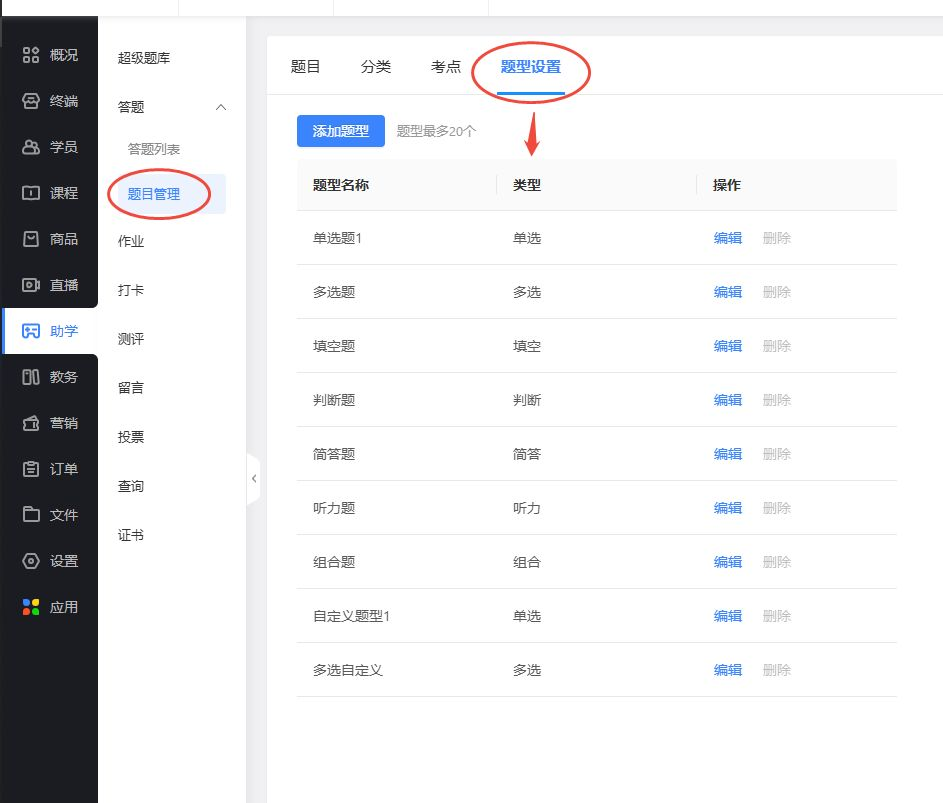 在教育管理后台点击【助学-题库】开启题库功能。如图: