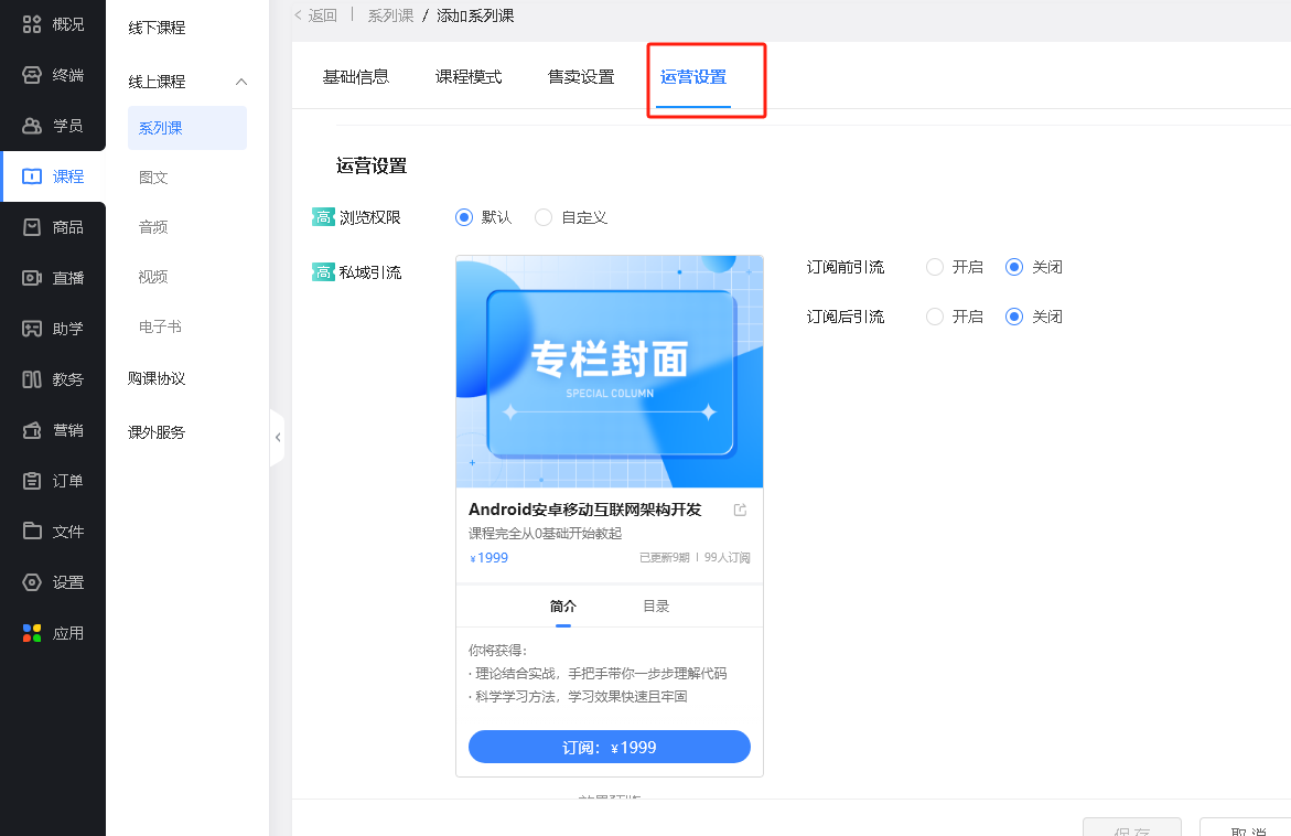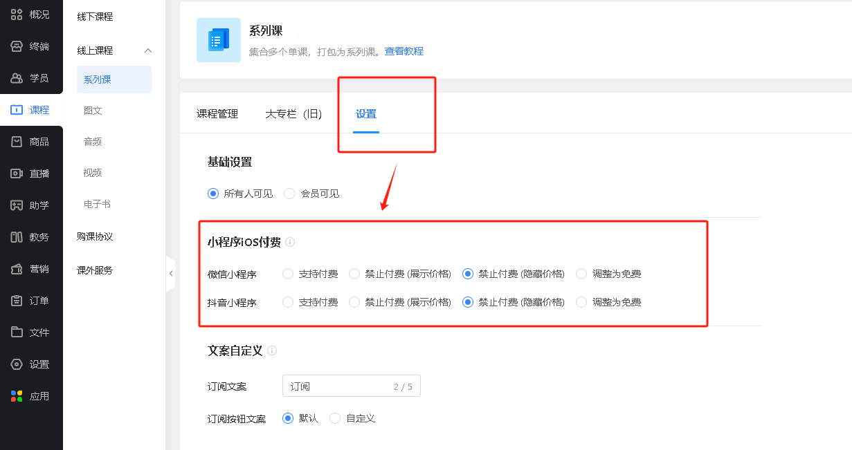 管理员可进入到【系列课-设置】中,设置系列课浏览权限以及iOS付费方式。