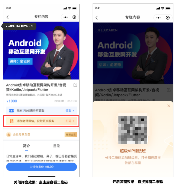 ① 订阅前引流:在用户点击系列课,未订阅时出现引流信息。可上传课程销售的联系方式,引导用户添加销售获取优惠或服务。