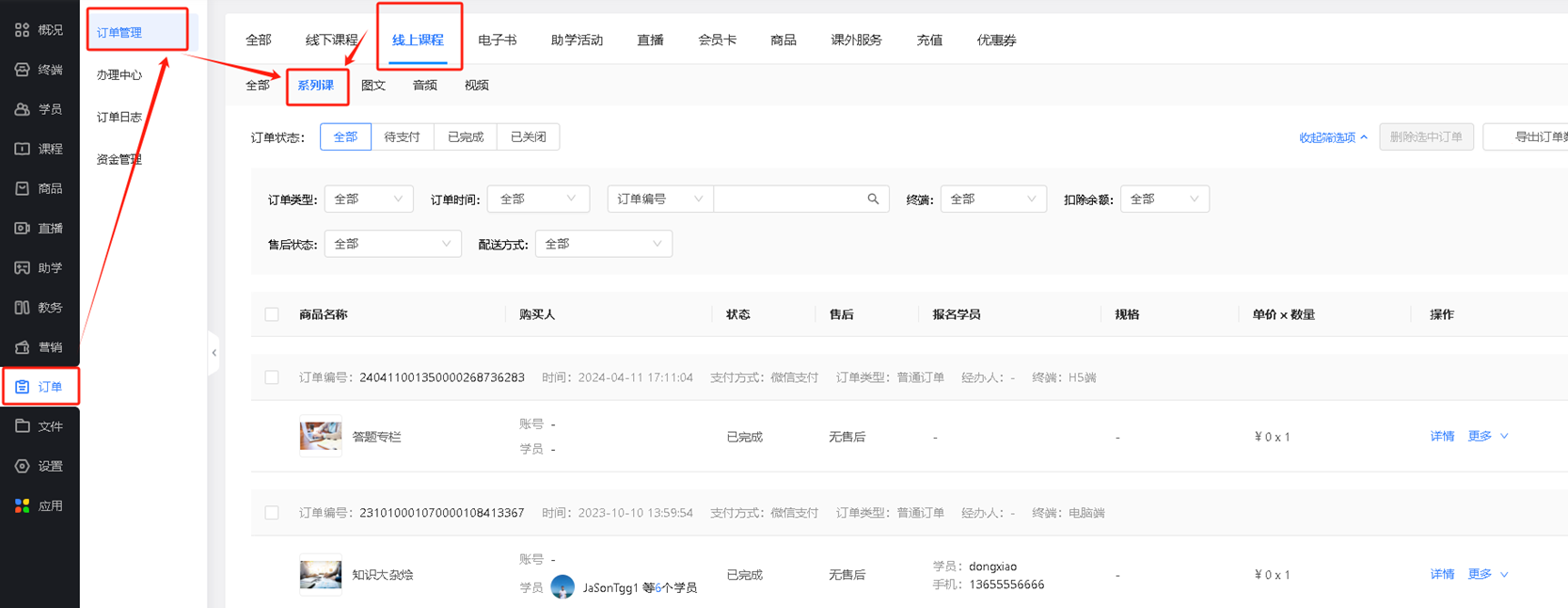 管理员可在管理后台【订单-订单管理-线上课程-系列课】中查看系���课订单。