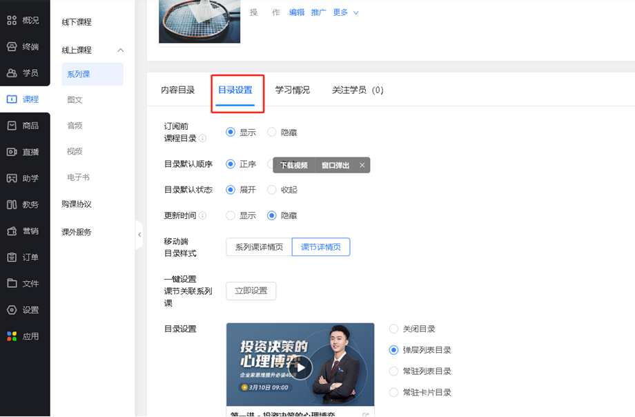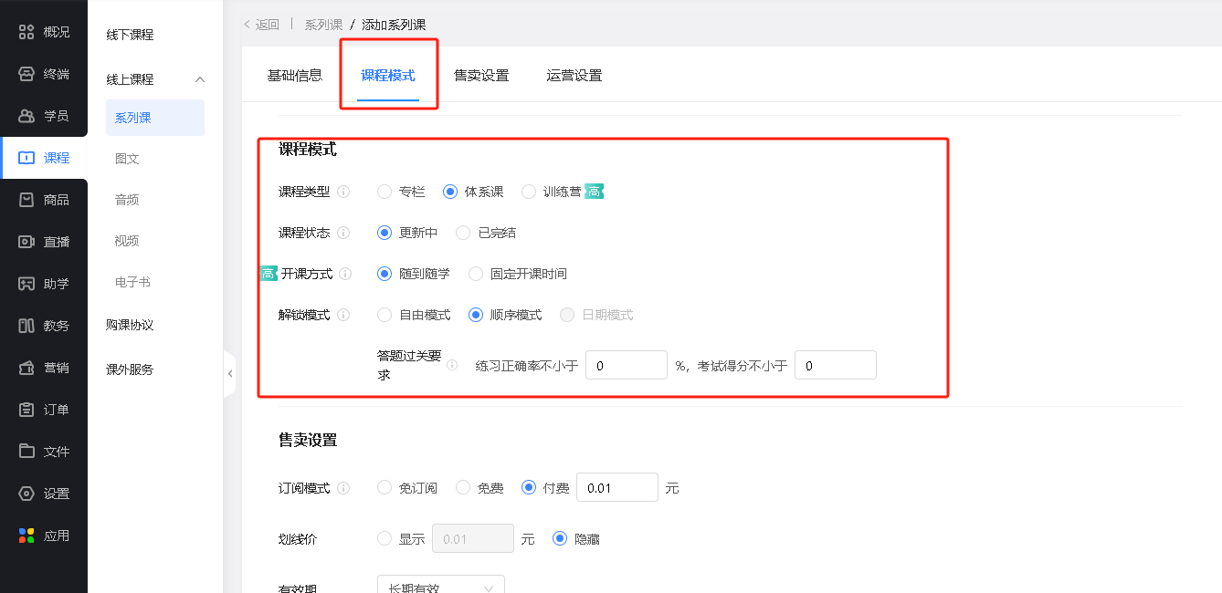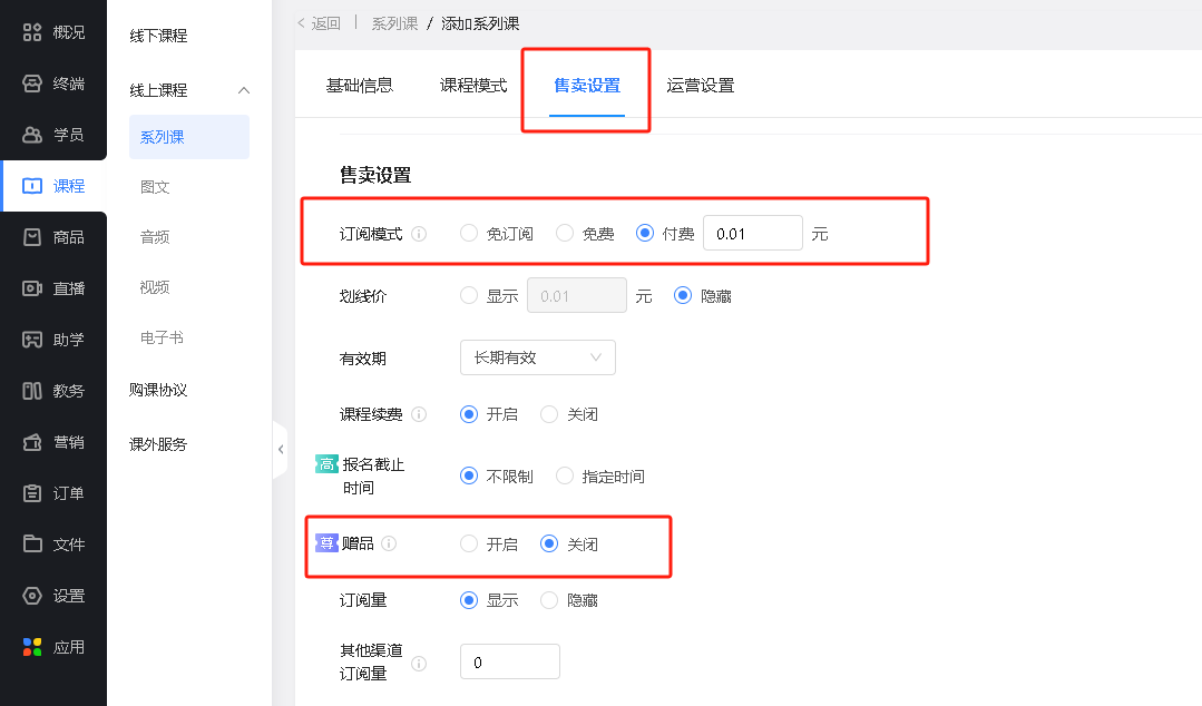 ↓ 知识付费相关,设置系列课付费模式与订阅量。还可设置购买系列课的赠品。