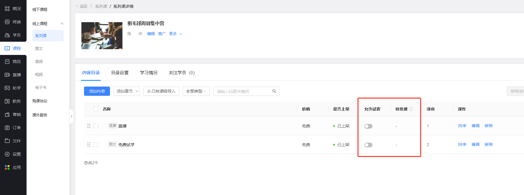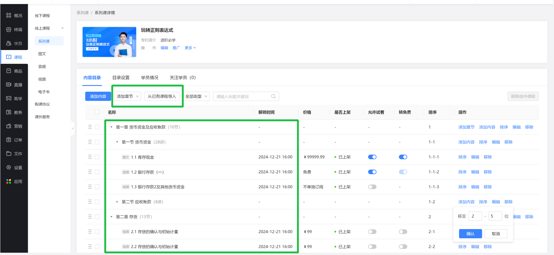 可对系列课内容进行删除、编辑、排序操作。