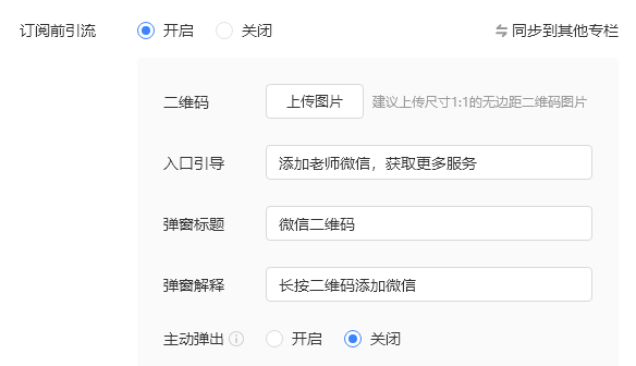↓ 设置私域引流:可设置在订阅前/后引导用户添加预设的联系方式,将用户引导至私域留存。