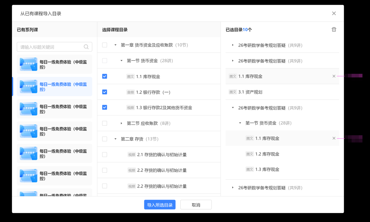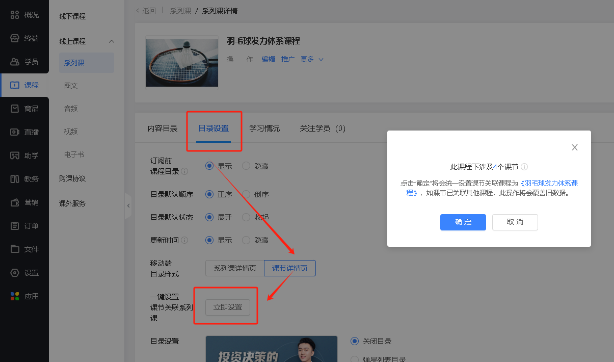 ① 一键设置课节关联系列课:通过此能力可以一键给课节设置或更换关联系列课