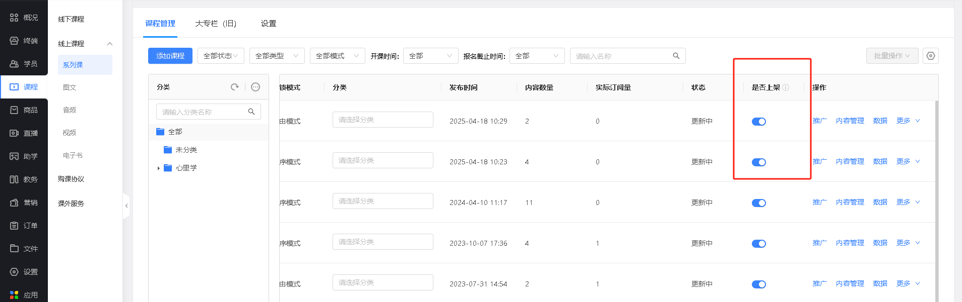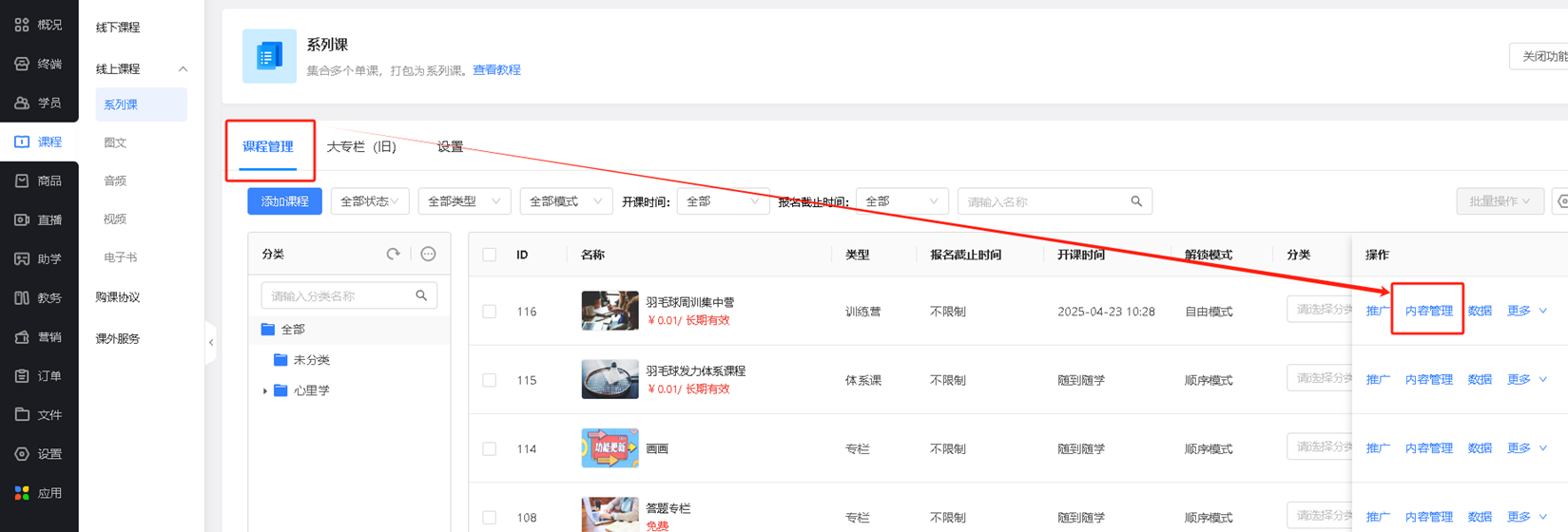 支持通过筛选状态来管理系列课。
