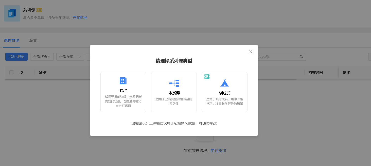 可添加专栏、体系课程、训练营三种不同的课程类型