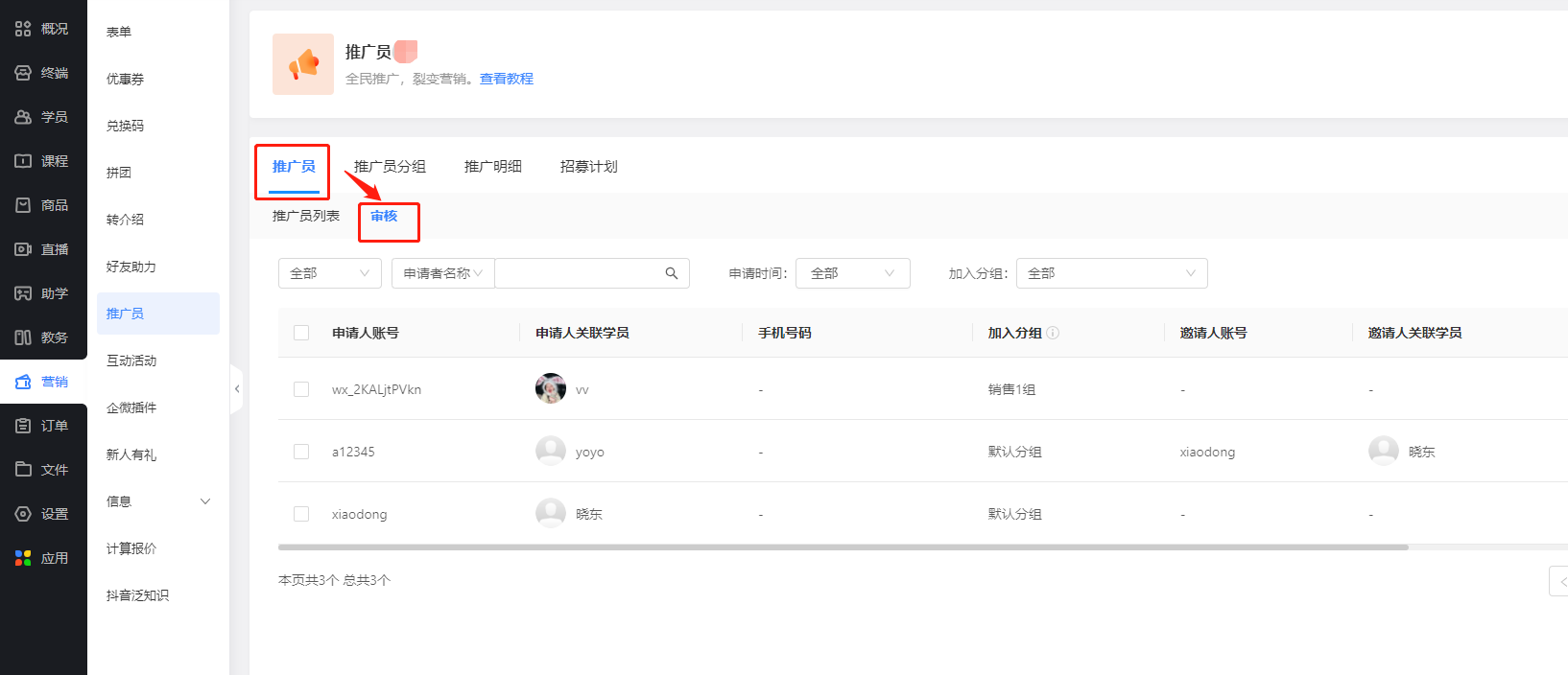 如开启推广员审核功能,用户申请推广员后,商家需在管理后台【营销-推广员】中进行审核,只有通过审核后用户才可以正常使用推广员功能。