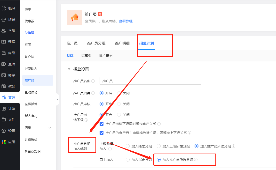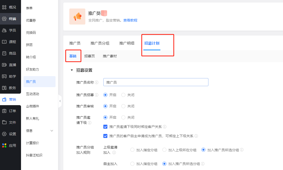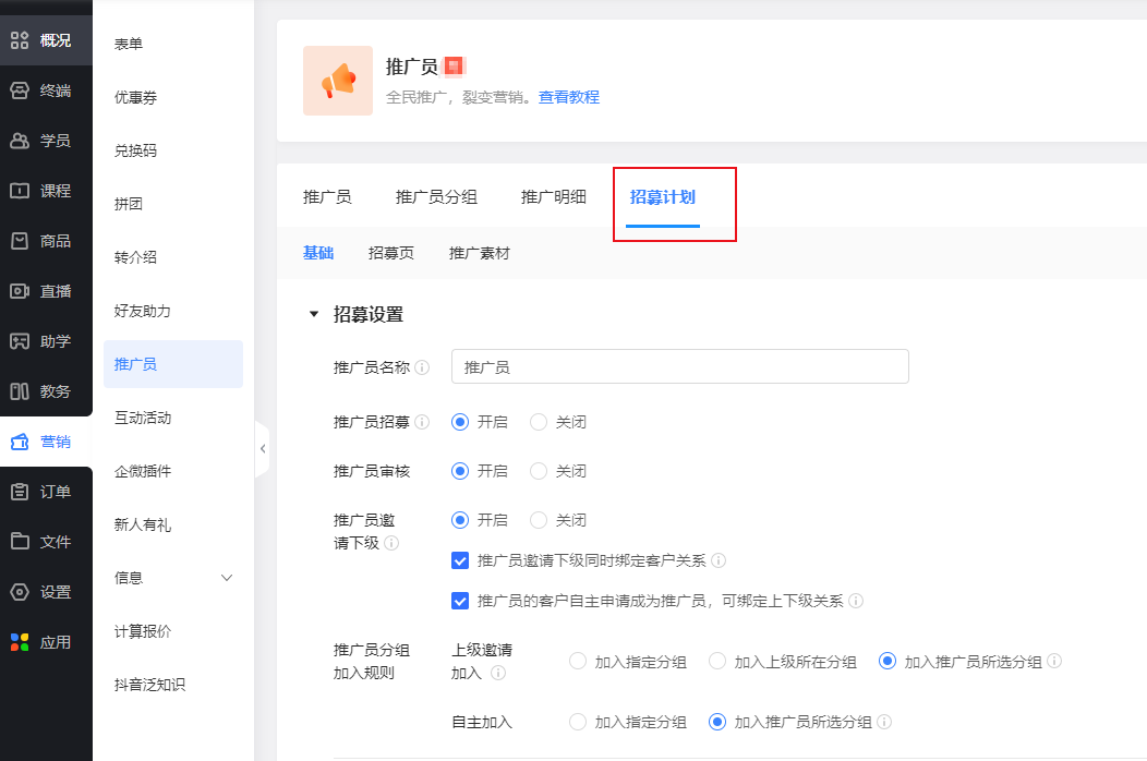 在管理后台【营销-推广员】中点击【招募计划】,对推广招募规则进行设置。