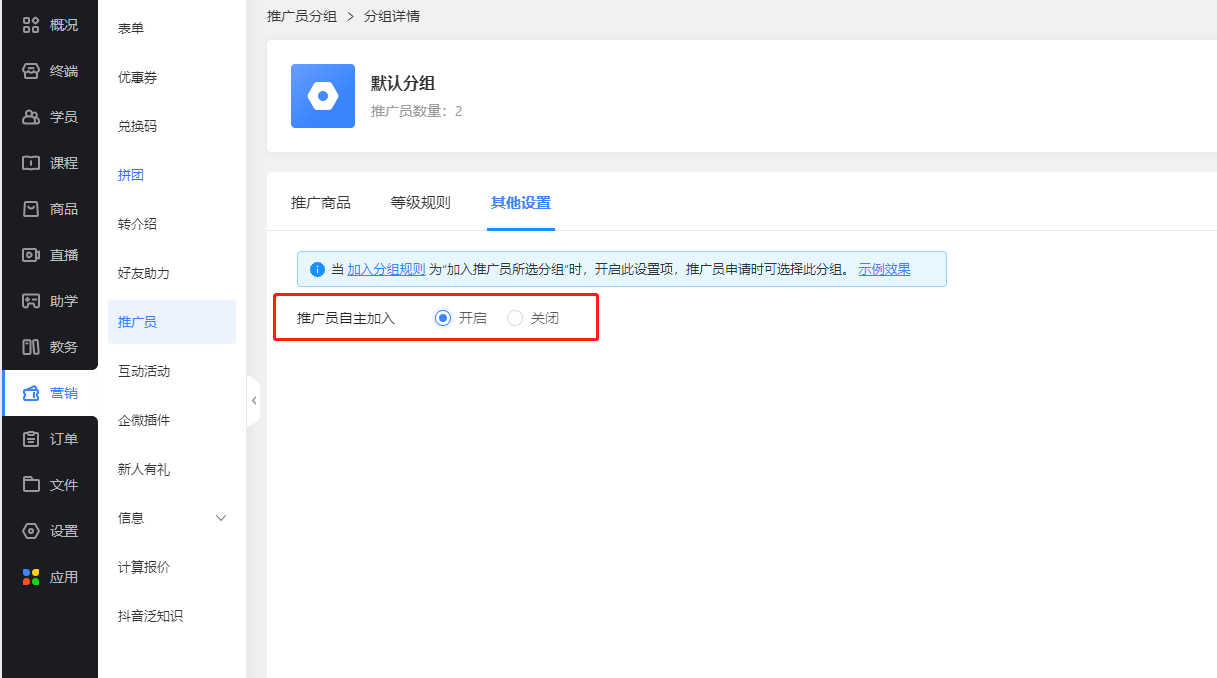 推广员招募:设置推广员招募状态,如果想暂时停止推广员招募,可设置关闭。