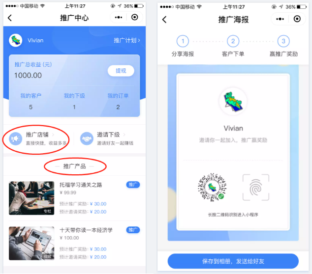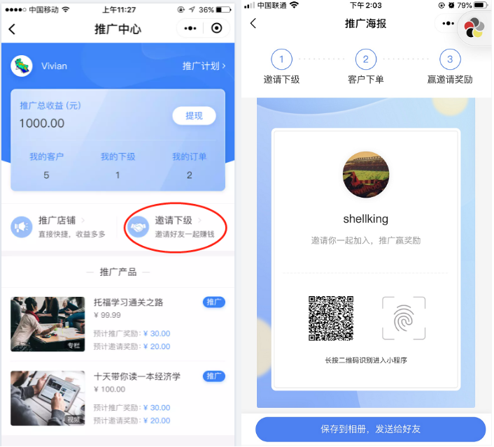 注:推广员功能中最多支持二级分销。上述示例图是展示社交裂变的效果图,和分销等级无关。