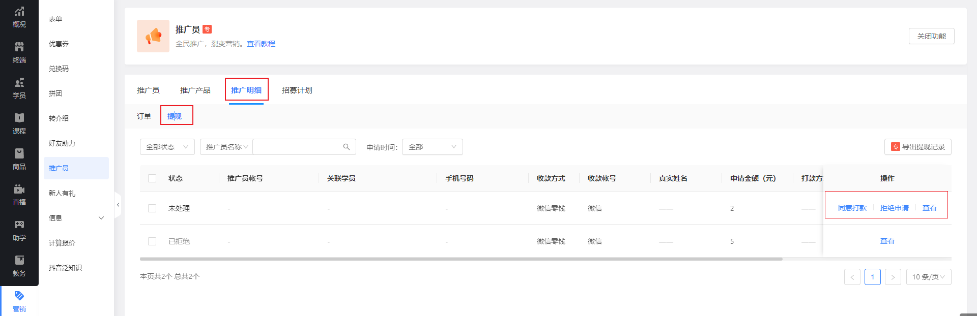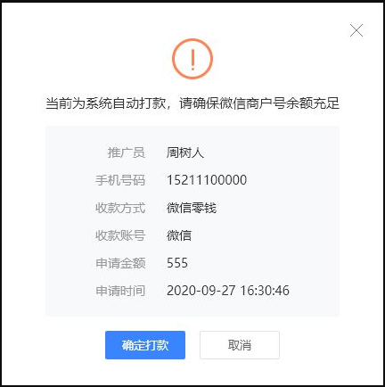 手动打款:推广员提交申请后,商家在管理后台审核提现,根据实际的打款情况,设置提现状态(已打款/已拒绝)。