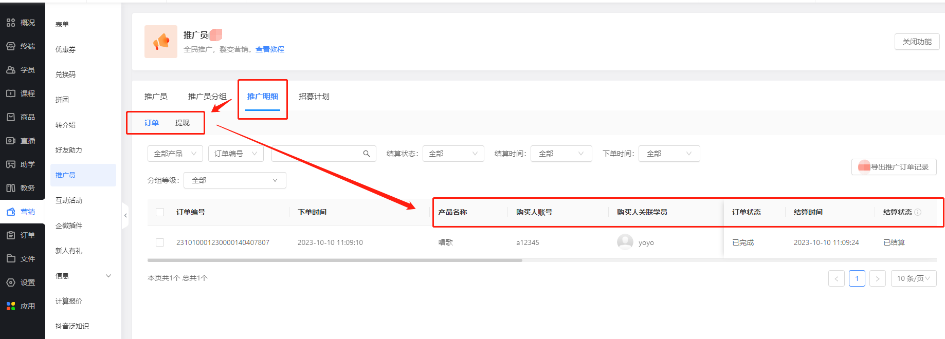 商家可进入管理后台,点击【营销-推广员-推广明细-订单】,看到客户购买商品后,整个推广关系链的情况,以及收益情况。