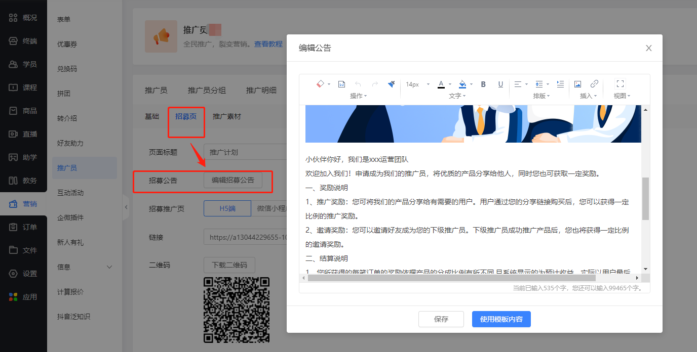 可以编辑招募内容,招募内容在访客端-推广计划页展示。