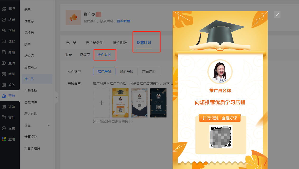 在推广素材中自定义推广海报、邀请海报和产品详情页。