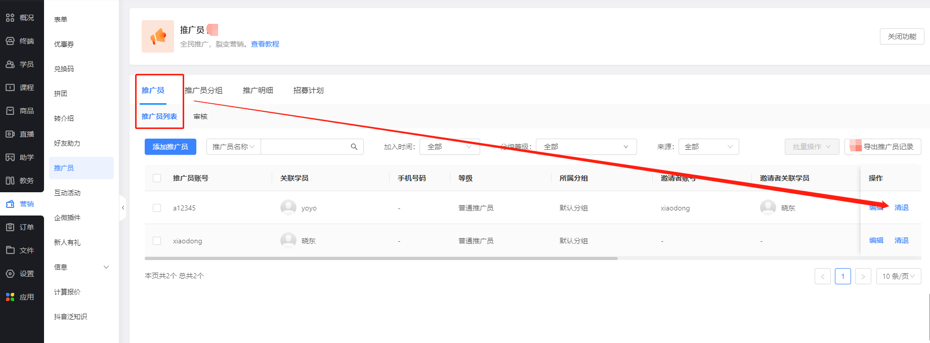 A:可在推广员列表中进行支持清退。