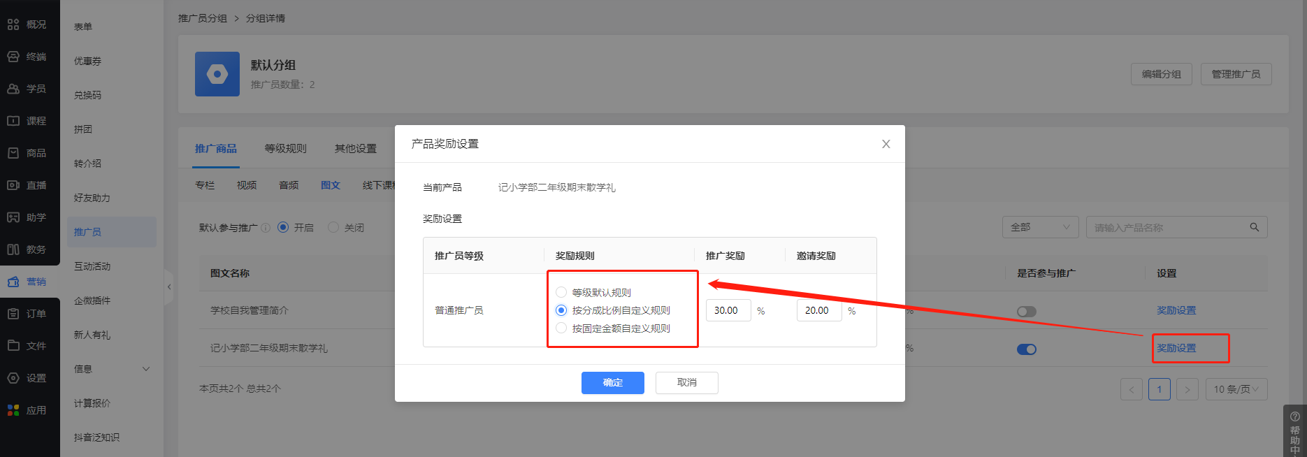 ② 按分成比例自定义规则:单独设置百分比计算推广奖励和邀请奖励