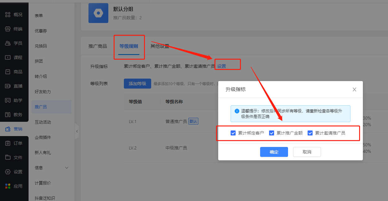 ① 升级条件:推广员较高可设置10个等级,可设置推广员每级升级所需条件,如累计绑定多少个客户,累计推广金额,累计邀请多少个推广员