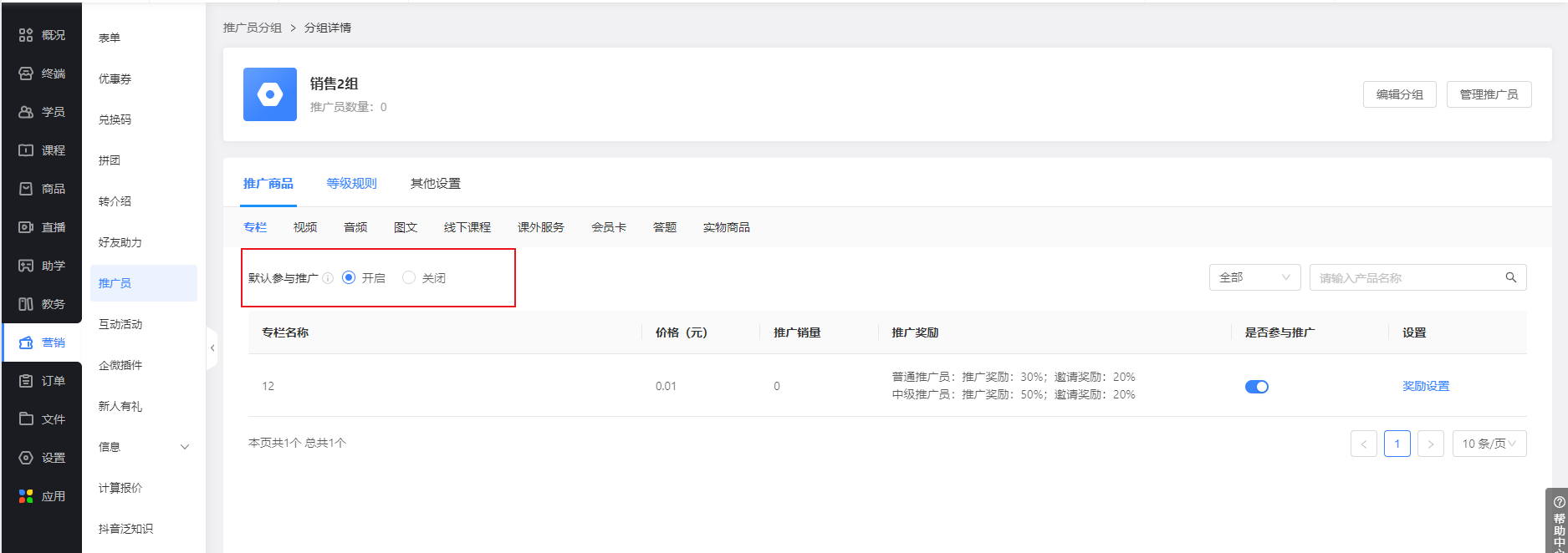 2. 添加推广员分组、推广产品、佣金提成