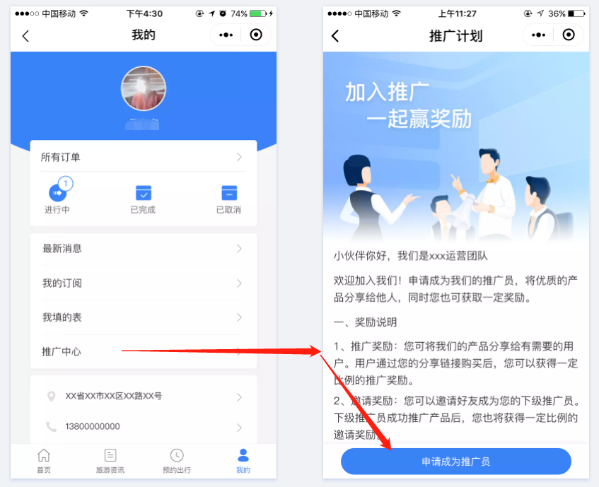 商家在后台设置好推广规则和推广产品后,访客端用户就可以通过“个人中心-推广中心”入口,申请成为推广员。