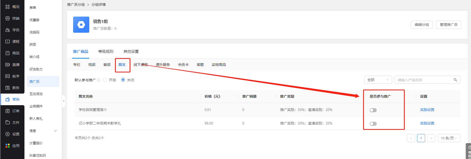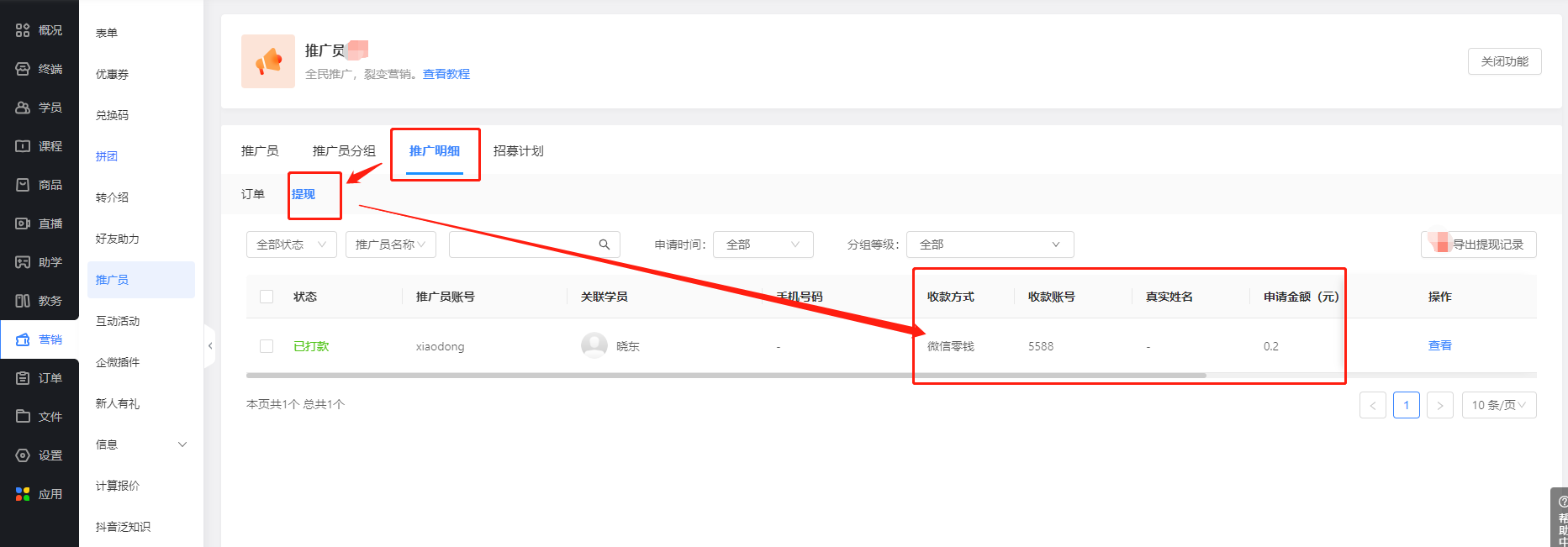 机构新开发了一门精品课程,需要推广提升销量,实现盈利;这时候如果发动内部员工在微信内学员社群和微信外社交平台宣传新课程,商家可将内部员工招募为推广员,鼓励内部员工积极推广,推广业绩在管理后台一目了然,方便商家对内做销售统计。