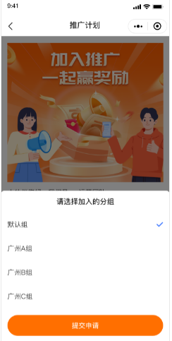 当“招募计划”中推广员分组功能为【自主加入推广员所选分组】时,开启了【推广员自主加入】的分组会出现在选项中,效果如图: