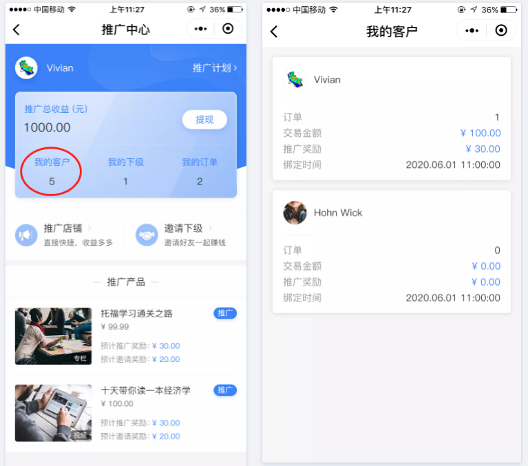 推广员点击“我的客户”,可查看推广绑定的所有客户。(即通过推广链接成功注册登录购买的客户)。
