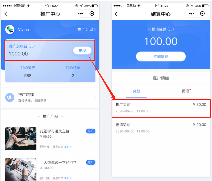 当绑定的客户购买推广商品且订单完成后,商家获得营收,推广员也会根据商家的设置获得推广奖励分成,上级推广员获得邀请奖励分成。