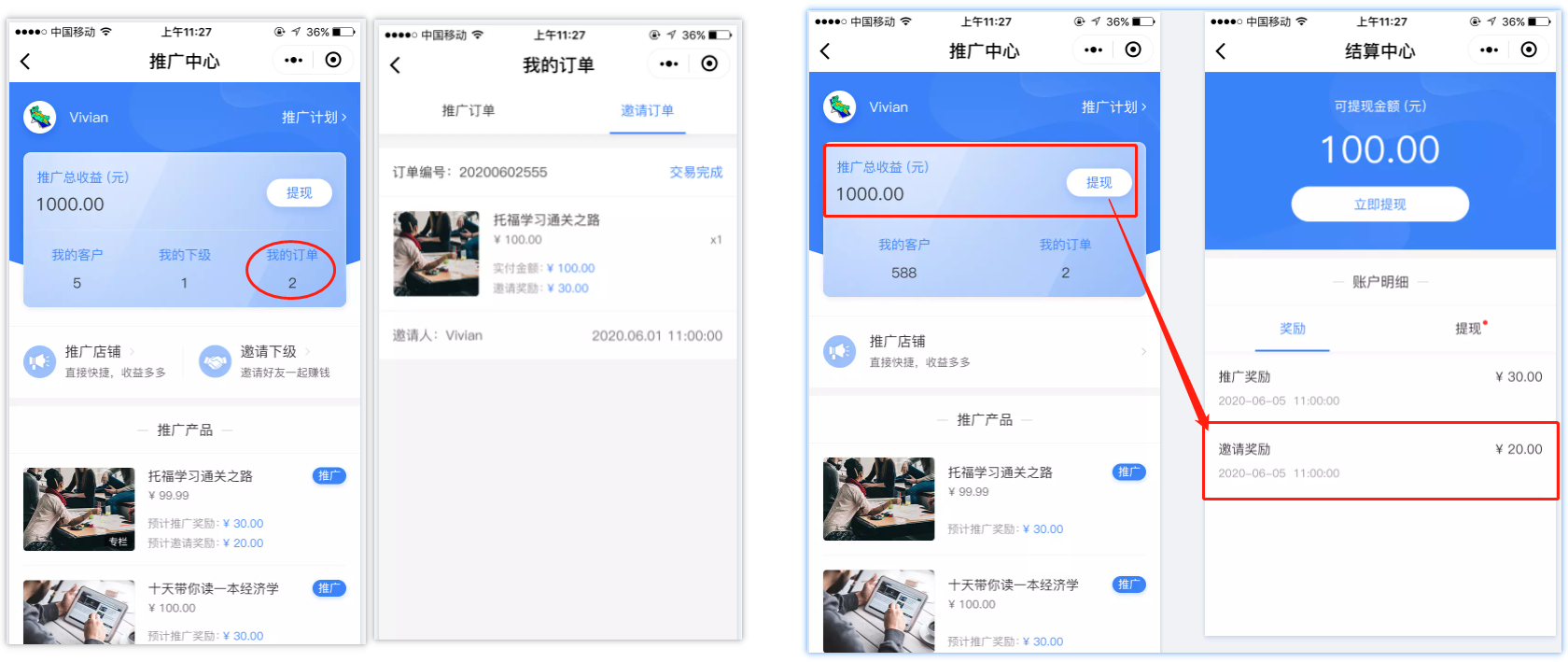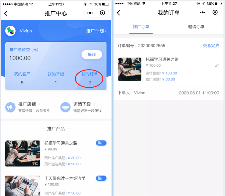 推广员A可在推广中心点击“我的订单”查看客户购买记录,查看推广奖励金额。