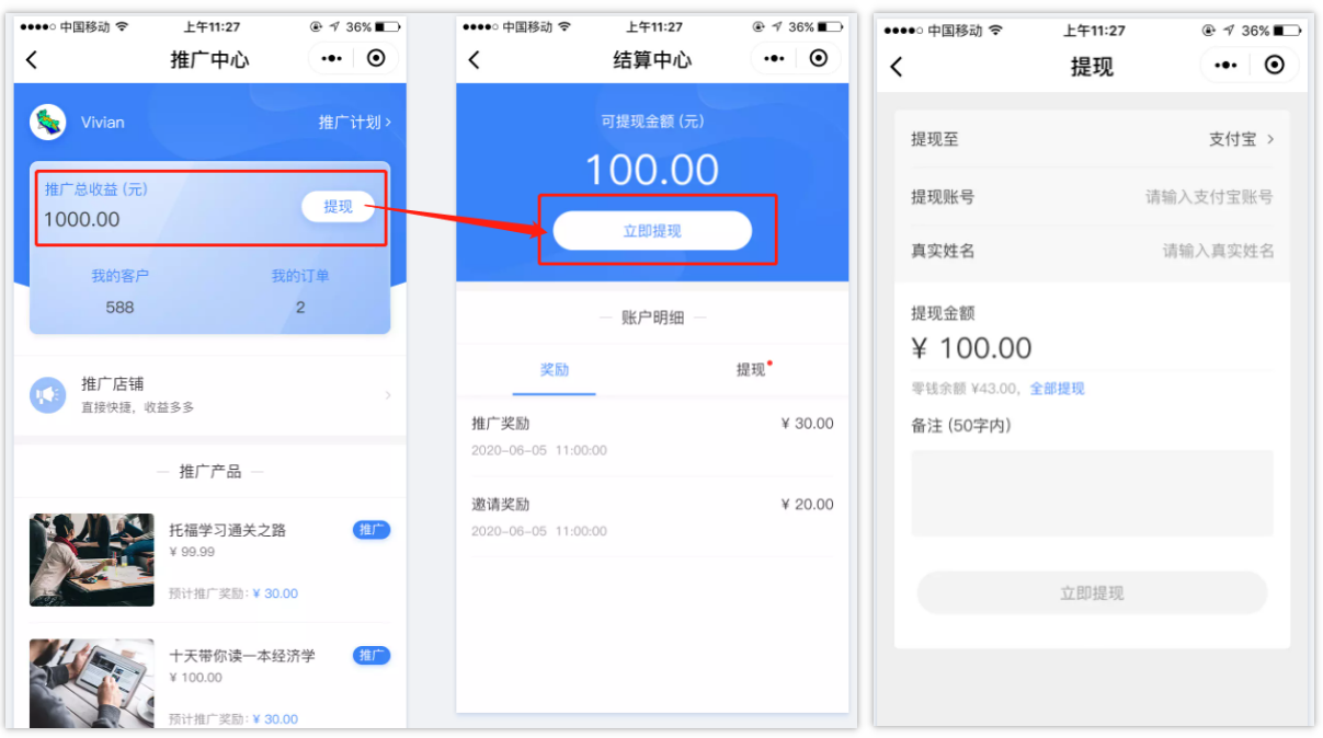 推广员推广累计达到提现金额要求后,可申请提现。