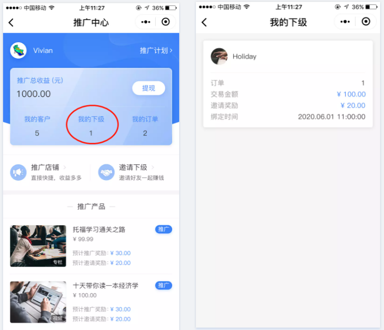 如果成功邀请下级,推广员可点击“我的下级”,查看所有邀请的下级推广员。