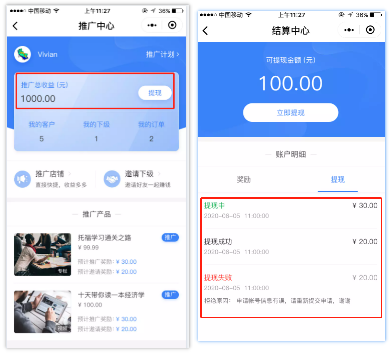 推广员到推广中心点击【提现】可查看提现结果。