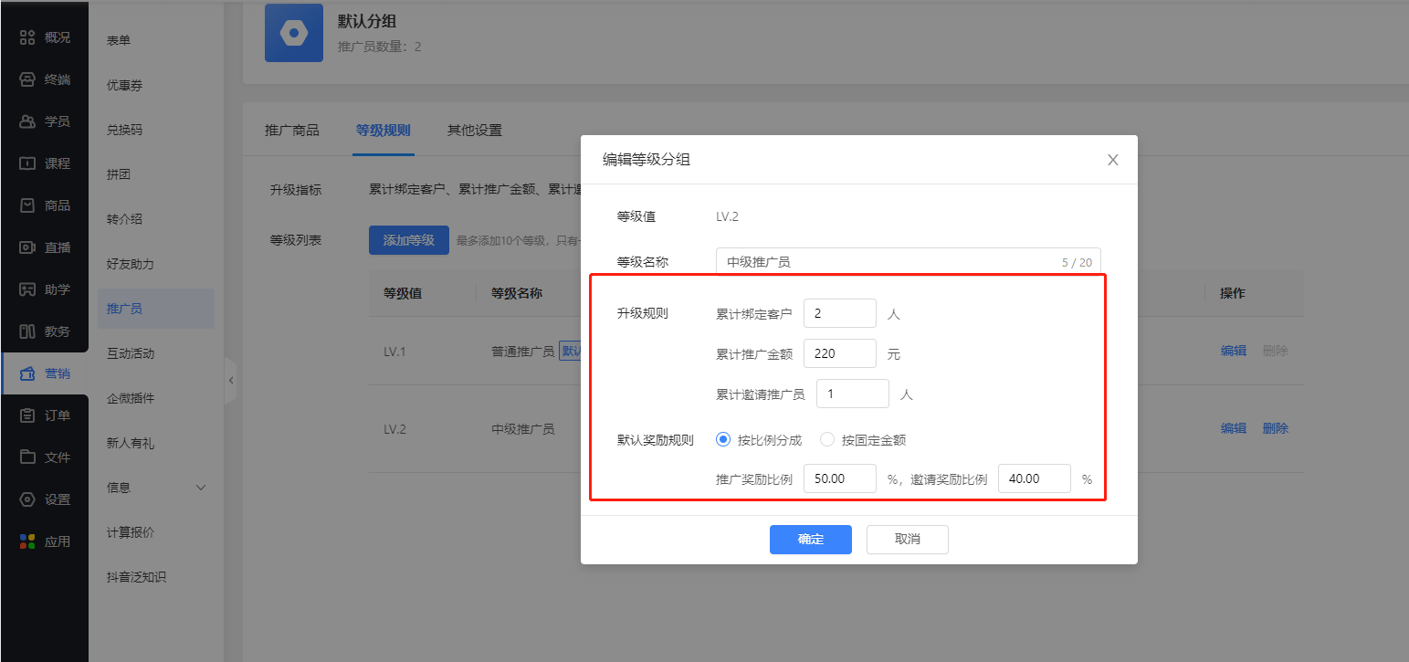 ① 等级默认规则:根据【等级规则】中,不同等级的推广员比例计算