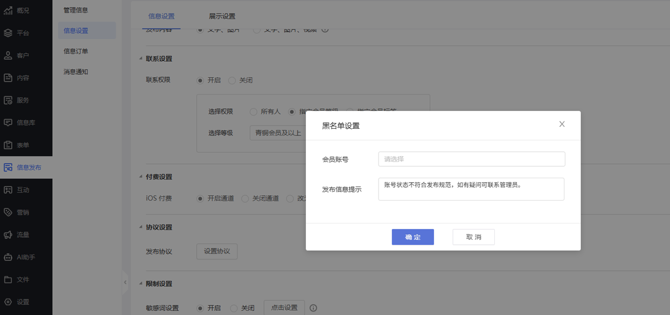 - 发布设置: 支持对全局或板块设置信息发布权限,可以设置所有会员均可发布,也可设置需达到特定等级或属于某一标签的用户才可以发布信息,未达到相关会员等级/不属于所属标签分类,引导相关用户升级会员(商家可结合付费升级等策略使用)