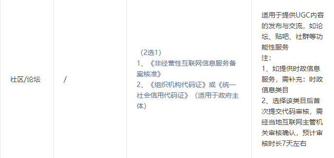 服务类目限制:使用信息发布功能,需要补充“社交-社区/论坛”类目。