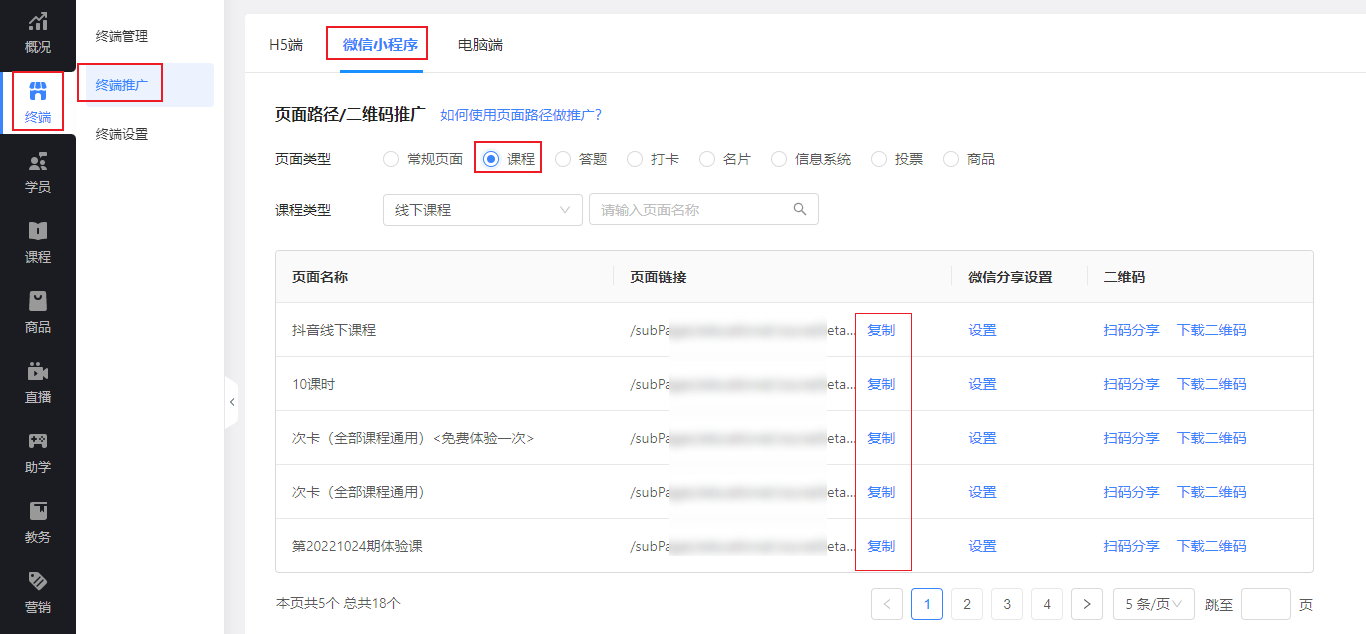 如何获取商品链接:进入教育管理后台点击【微信小程序】,点击【课程】选择课程类型,并复制页面链接(即商品链接)。