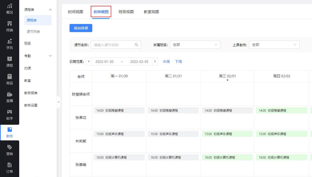老师登录成员账户,在管理后台点击【教务-课程表-老师视图】进行查看。